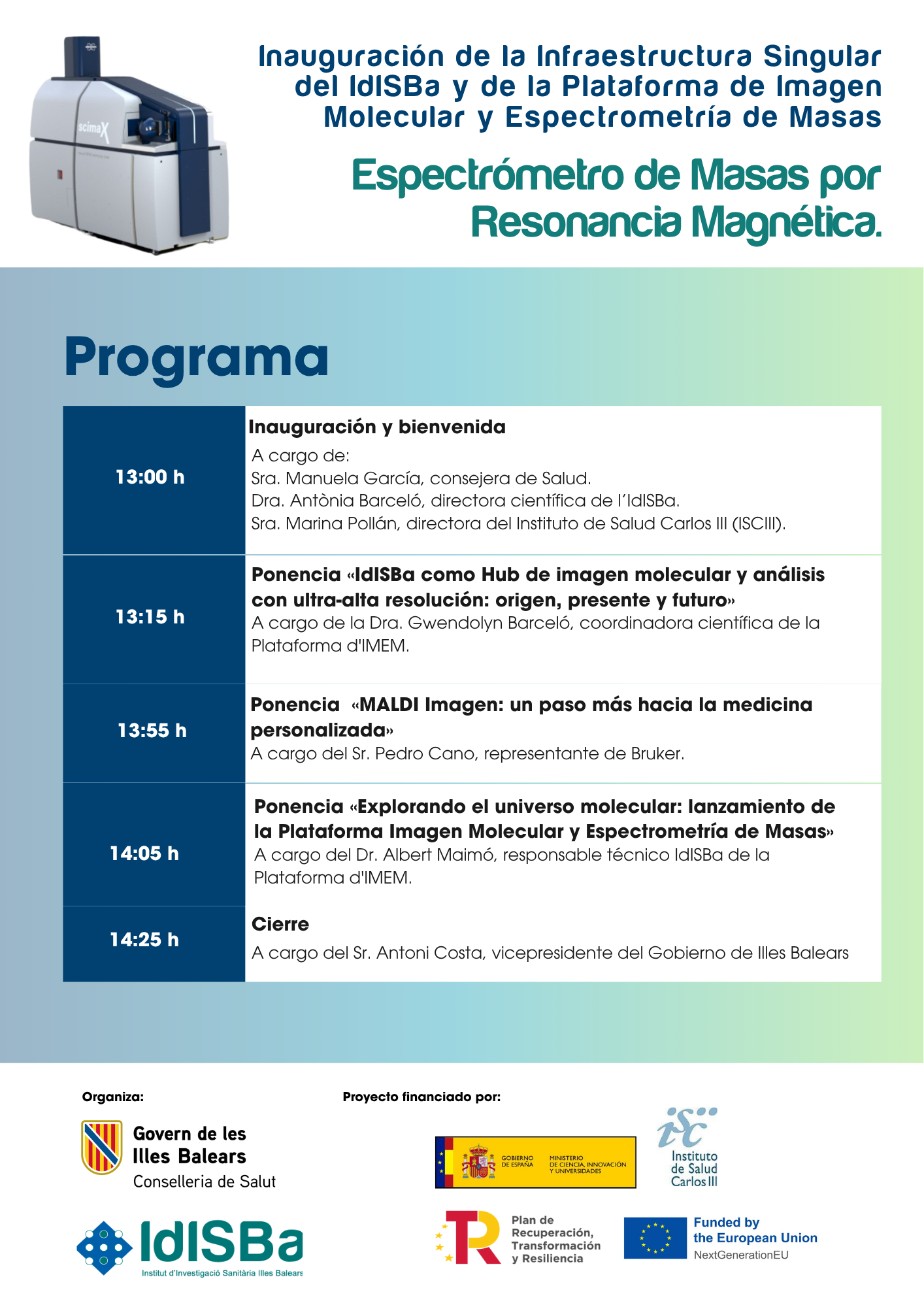 ’Institut d’Investigació Sanitària Illes Balears (IdISBa), en col·laboració amb la Conselleria de Salut, té el plaer de convidar-vos a l’acte d’inauguració de la nova Infraestructura Científica Singular d’Imatge Molecular i Espectrometria de Masses, una fita que reforça el compromís de les Illes Balears amb la recerca biomèdica d’avantguarda.