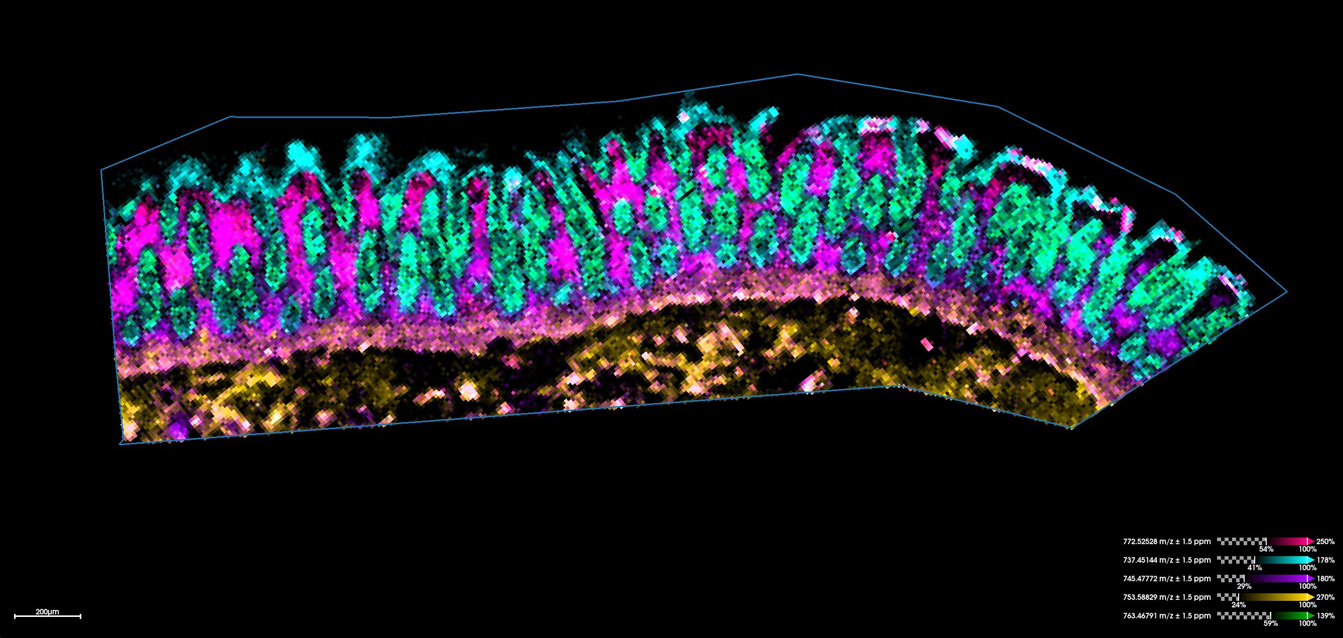 • Imagen molecular por espectrometría de masas de ultra-alta resolución por resonancia magnética, destinada a la detección y localización espacial de metabolitos y lípidos en tejidos, con una precisión y sensibilidad que permiten estudios detallados de composición molecular (Imagen 4).